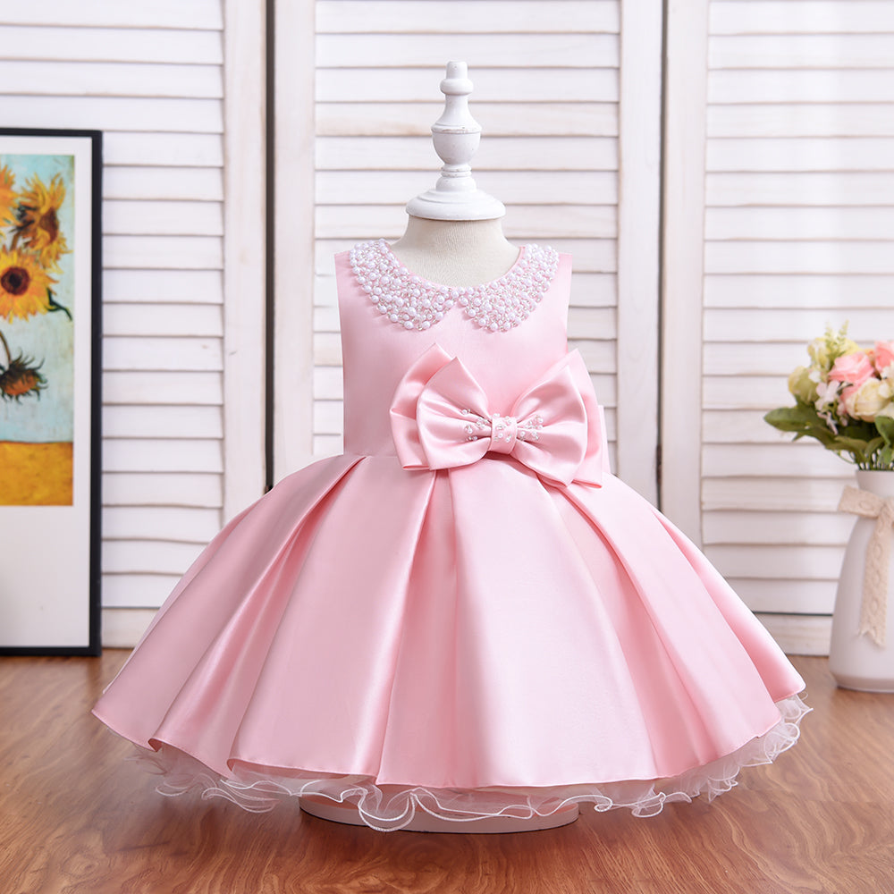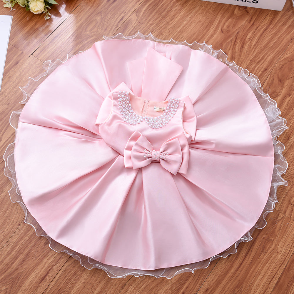 Dress have two bows, one small in front and another big at bottom and both have bead work in it