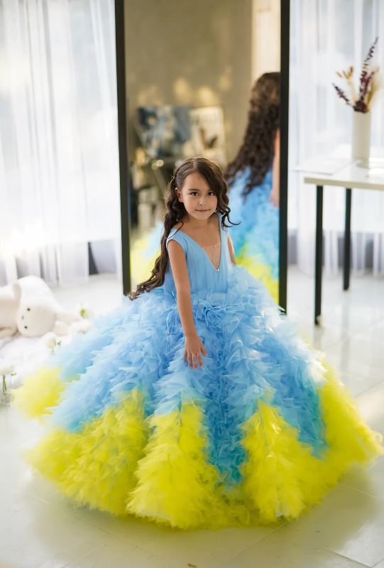 Beautiful light blue and lime yellow coloured flower girl dress for beautiful princess